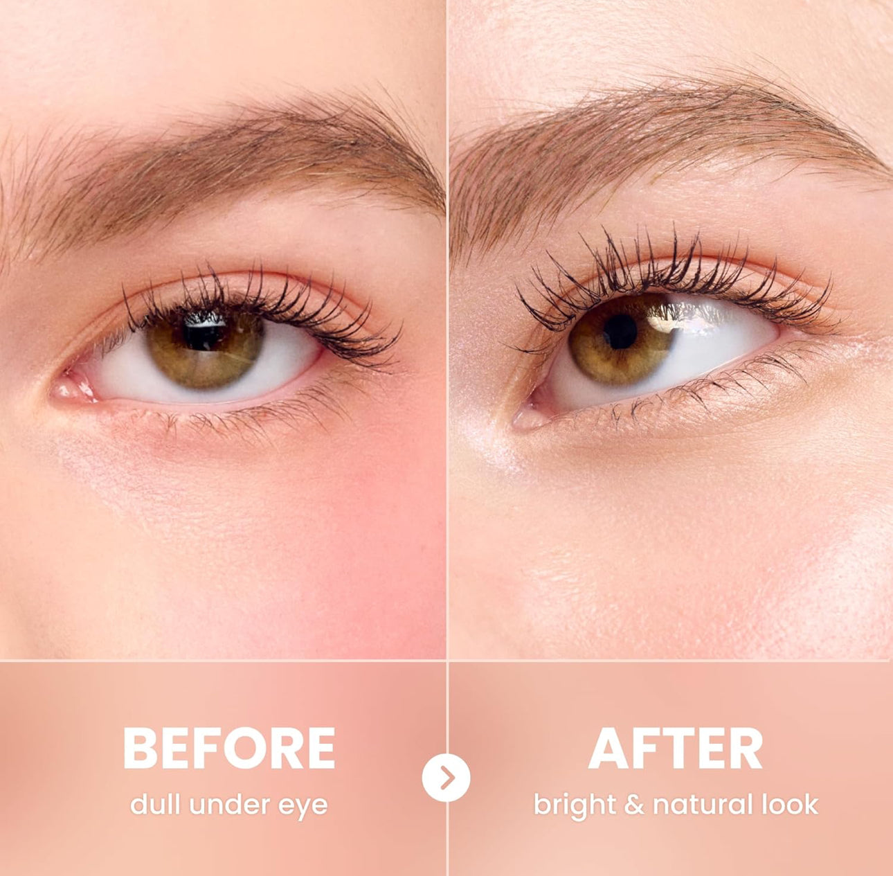 Apply the cool-pink highlight on the under-eye mound → add a fine shadow line beneath → tap gently to blend.