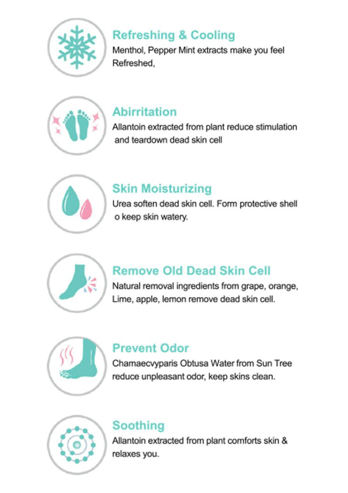 - - Contains strong antibacterial ingredient hinoki cypress to reduce foot odor, as well as natural fruit acids extracted from grape, orange, and lime for gentle exfoliation